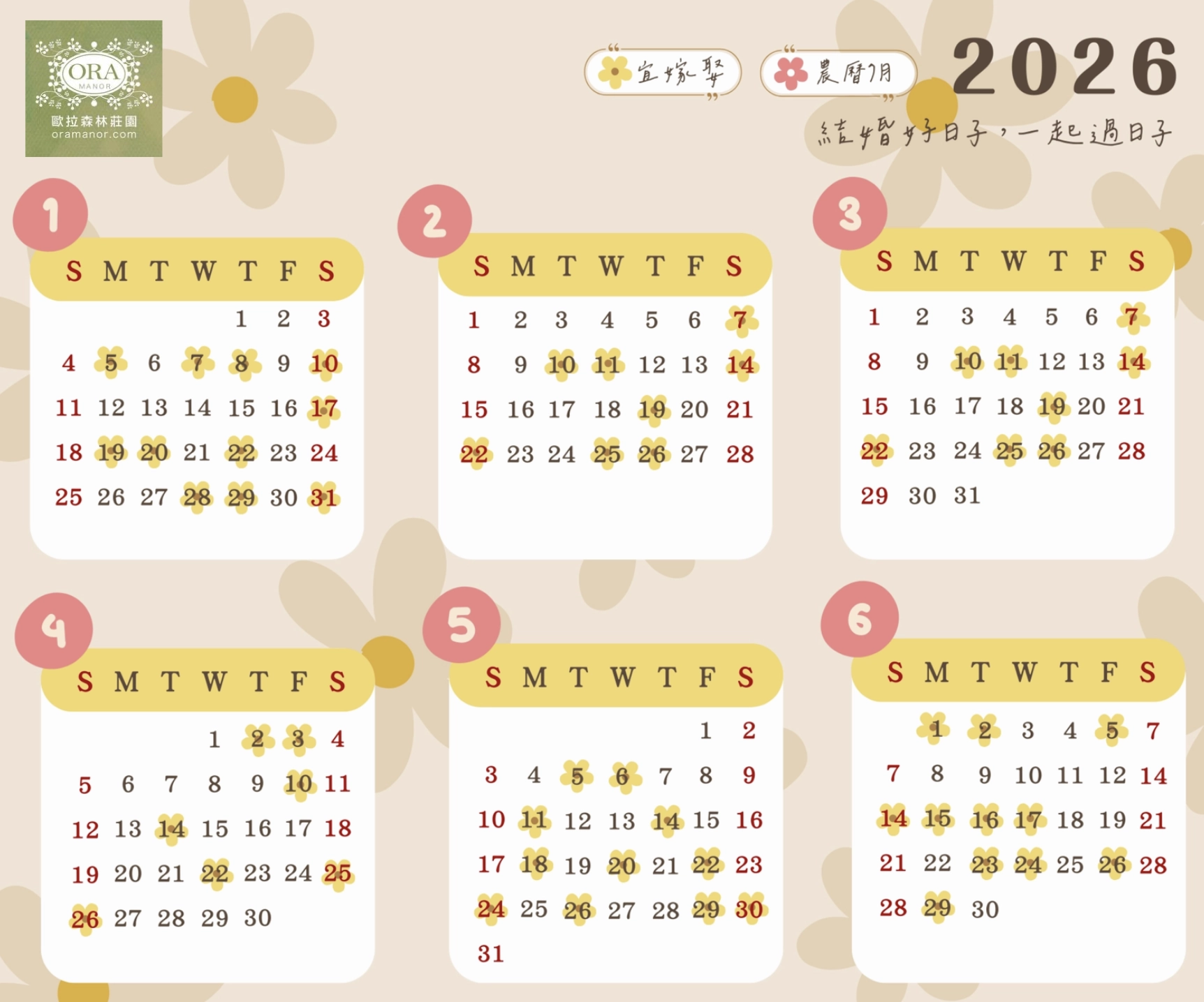 以下整理 2026 年依農民曆標示之宜嫁娶日,新人可先圈出 2–3 個理想日期,再同步洽詢場地檔期。